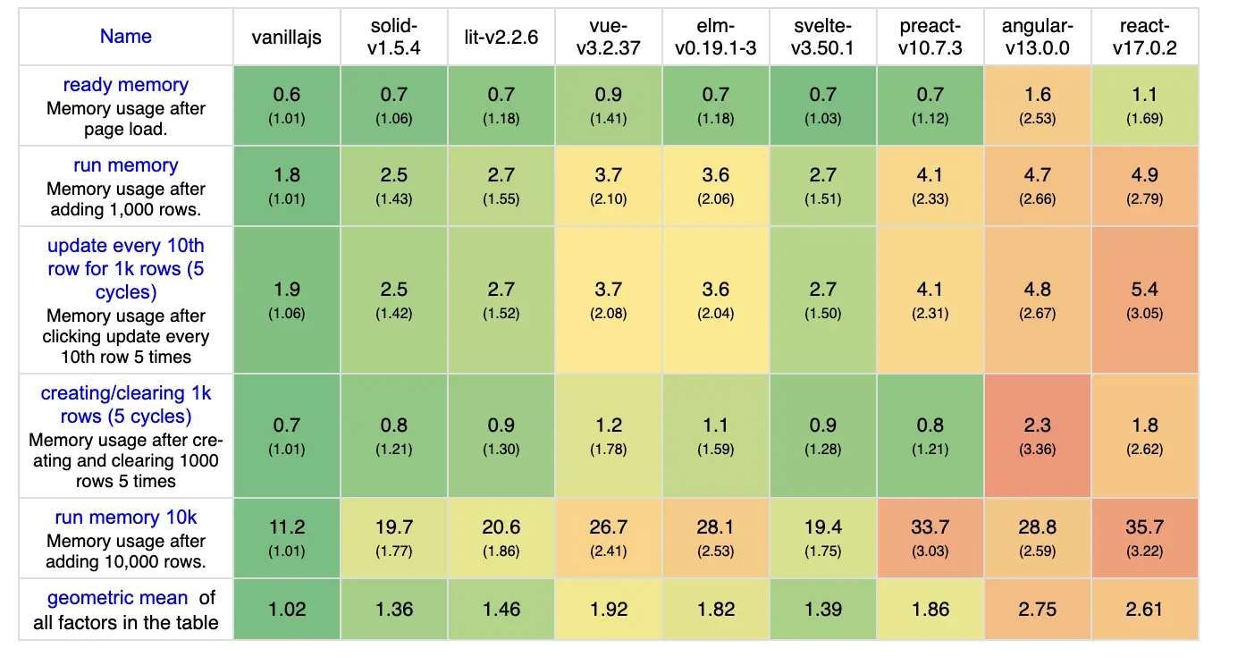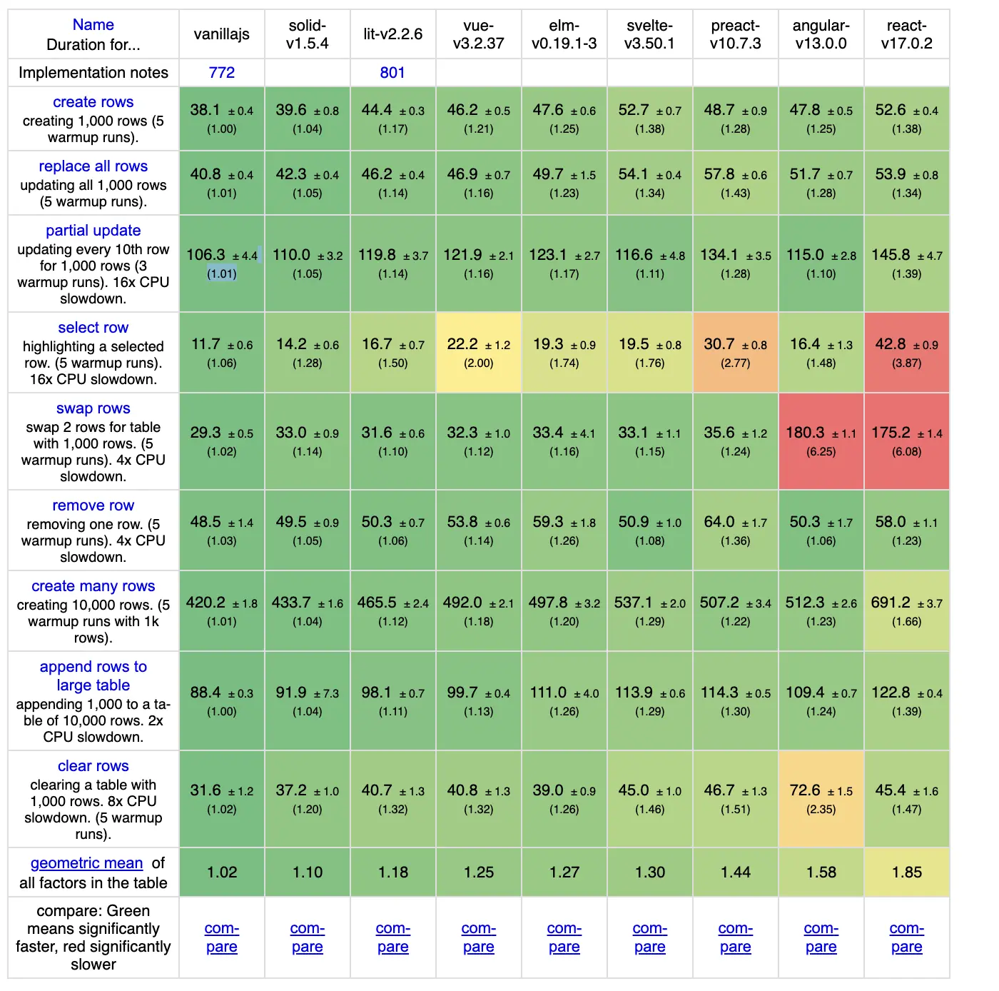 - 性能!性能!性能差!在🚀中,React 性能竟到了 1.85,简单来说,它运行所花的时间时原生 JS 的大约 1.85 倍!多么恐怖啊😱!Angular 都比 React 好多了。