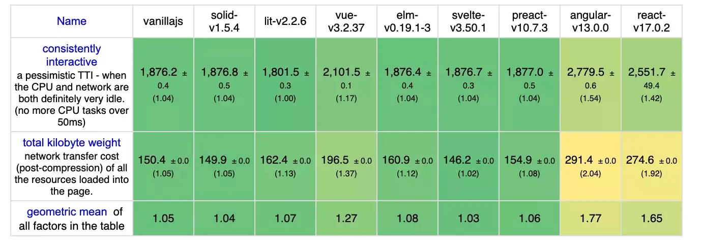 - 它的性能还没有 Vue 好!它在🚀中获得了1.30,比 Vue 竟然还要慢一点。要不是它 Bundle Size 令人震惊,还有多少人会用它呢?