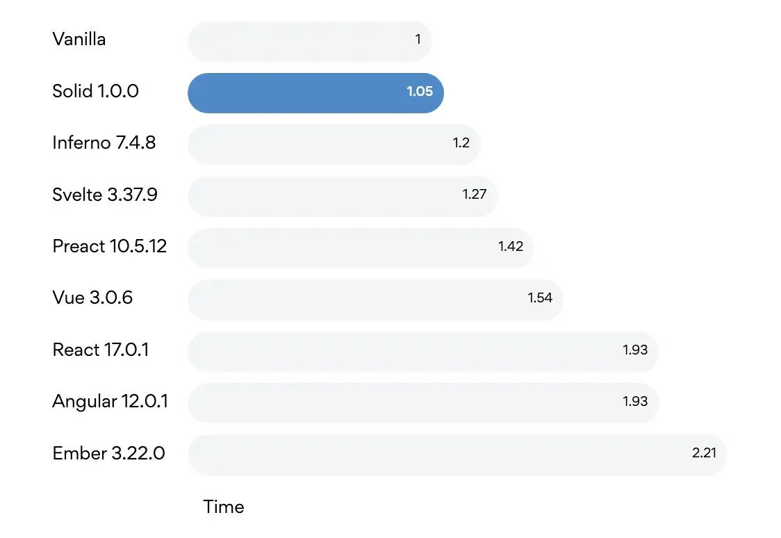 我相信有些人可能甚至不知道 Solid 是什么。Solid 可能是性能王了。首先,Solid 在🚀中获得 1.10,换句话说,它的运行速度是目前所有主流框架中毫无疑问的最快的,速度和原生 JS 几乎持平。Bundle size 也还可以,Gzip 后只有 7 kb。为了犒劳你看到这里,贴个我自己做的测试: